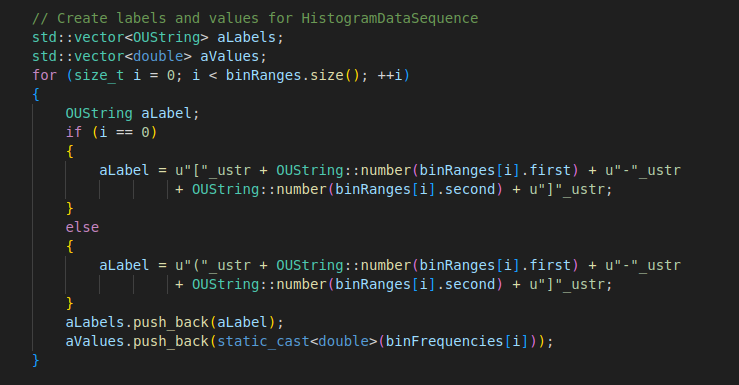 Purpose: This class manages a sequence of data points specifically formatted for use in histogram charts within LibreOffice. It's designed to handle both numerical data (like bin frequencies) and potentially textual data (like bin labels), although, in the provided snippet, the textual data functionality is not fully implemented.